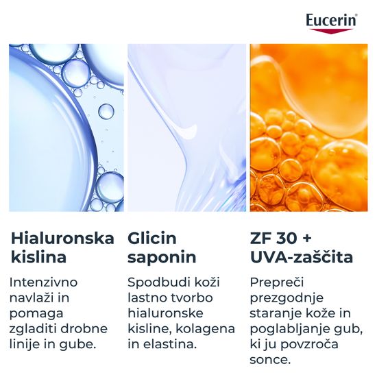 Eucerin Hyaluron-Filler dnevna krema ZF 30 za vse tipe kože deluje proti procesu staranja. Zapolni globlje gube in intenzivno navlaži za čvrstejši videz kože. Z ZF 30 in UVA-filtrom ščiti kožo pred prezgodnjim staranjem, ki ga povzročajo poškodbe kože zaradi sonca.
