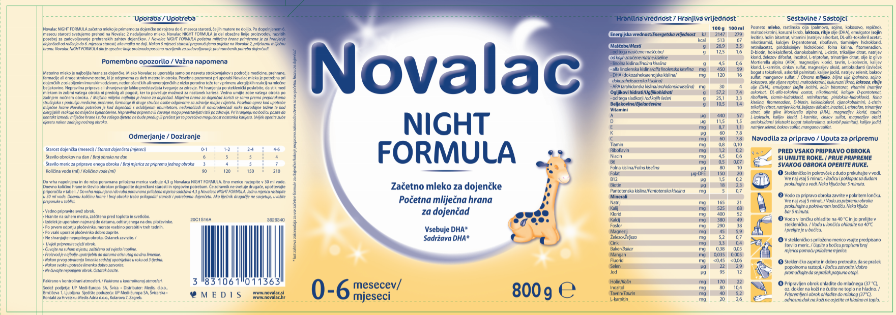 Novalac Night Formula je mleko s počasi prebavljivimi ogljikovimi hidrati za dolgotrajno sitost dojenčka, brez povečanega vnosa kalorij. Primeren je za pogosto lačne dojenčke podnevi in kot nočni ali večerni obrok. Novalac Night Formula zadovolji vse prehranske zahteve dojenčka do 6. meseca starosti. Sedaj je na voljo v novi sestavi in 800g pakiranju. Novi sestavi sta dodani dokozaheksaenojska kislina (DHA) in arahidonska kislina (ARA), prilagojena je vsebnost nekaterih vitaminov in mineralov. Mleko Novalac sedaj vsebuje še več vitaminov D, K, B1, B6. Nove mlečne formule so tako še bolj prilagojene potrebam dojenčkov.