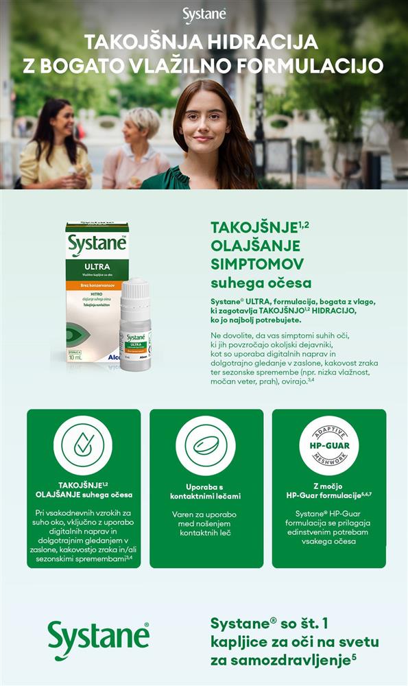 Kapljice za oči Systane ULTRA ščitijo očesne površine, lajšajo simptome suhega očesa in izboljšajo kakovost vida, začasno lajšajo suhost, povezano z uporabo kontaktnih leč, zagotavljajo vlaženje ali ponovno navlažitev kontaktnih leč.